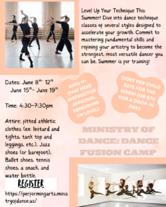 Dress Code: For the younger camps, standard ballet attire required. For the 11+ intensives, stick to solid-colored leotards or fitted dance tops and leggings fitted athletic clothes, Jazz shoes (or barefoot), Ballet shoes, and tennis shoes.